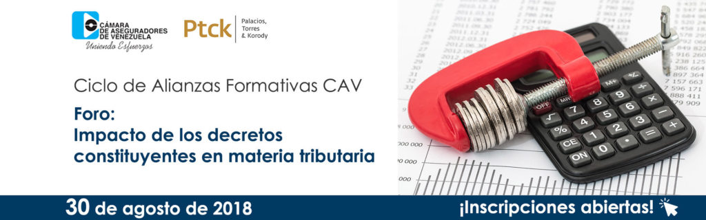 La CAV y PTCK se unen nuevamente para desarrollar un ciclo de alianzas formativas La actividad organizada en trabajo conjunto con el Escritorio Jurídico Palacios, Torres & Korody (PTCK), a través de la iniciativa CAV de formación, CAVConex, sirvió como un lugar de encuentro e intercambio de opiniones y perspectivas entre los actores del sector. (Prensa CAV) La Cámara de Aseguradores de Venezuela (CAV), reunió el pasado jueves 30 de agosto de 2018 un grupo de especialistas en materia tributaria, como parte del Ciclo de Alianzas formativas que realiza la casa gremial para fortalecer la actividad aseguradora nacional y la capacitación constante de los actores vinculados al sector. En este sentido, ejecutivos en el área de finanzas, impuestos y consultoría jurídica, fueron algunos de los profesionales que participaron en el Foro: Impacto de los decretos constituyentes en materia de reforma tributaria. Los abogados Juan Korody y Leonardo Palacios, ambos del escritorio jurídico PTCK y miembros del Consejo Directivo de la Asociación Venezolana de Derecho Tributario (AVDT), fueron los expertos encargados de llevar a cabo la actividad mediante un análisis relacionados con los recientes anuncios realizados por el Ejecutivo Nacional, destacando entre sus ponencias, el régimen temporal de pago de anticipo de IVA y ISLR; la reforma de la Ley que establece el IVA; así como, la Ley de Impuesto a las Grandes Transacciones Financieras. Esta nueva actividad del Ciclo de Alianzas Formativas CAV-PTCK, se llevó a cabo en la sede de la CAV, ubicada en la urbanización El Rosal, Caracas; con una duración de tres (3) horas académicas, en donde los asistentes pudieron interactuar, expresar sus inquietudes y obtener respuestas a sus interrogantes.