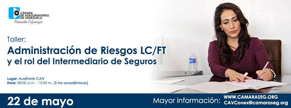 Taller: Administración de riesgos LC/FT y el rol del intermediario de seguros En la sede de la Cámara de Aseguradores de Venezuela (CAV), se desarrolló el miércoles 22 de mayo el Taller: Administración de riesgos LC/FT y el rol del intermediario de seguros; actividad exclusiva para intermediarios y agentes de seguros de las empresas afiliadas a esta casa gremial. El evento estuvo enmarcado en los alcances de la Administración de Riesgos de Legitimación de Capitales y Financiamiento al Terrorismo, y contó con la participación, en calidad de facilitadores, de Emiraly Morillo y Ronald Milano, ambos Oficiales de Cumplimiento pertenecientes al Comité Asesor CAV de PCLC/FT. Durante la actividad se abordaron los siguientes temas: Marco Legal; Riesgos asociados a LC/FT; Ilustración de casos cotidianos; Recomendaciones; y Lista OFAC, alcances y consecuencias en Venezuela.